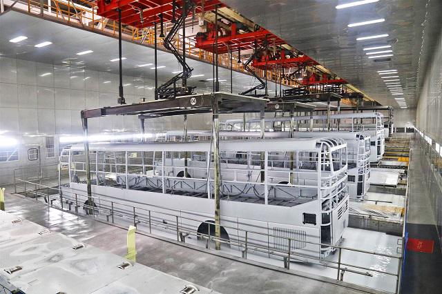 Dây chuyền hàn dòng xe bus lớn ứng dụng hệ thống monorail giúp việc di chuyển mảng rời body và body hoàn thiện dễ dàng hơn.