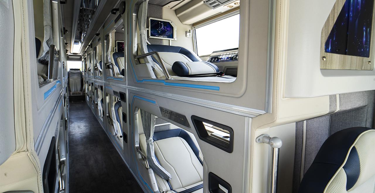 Khoang giường với phong cách thiết kế đậm dấu ấn không gian, tinh tế trong từng chi tiết, trang bị các tiện ích giải trí cao cấp cho từng khoang hành khách như: màn hình LCD, cổng kết nối USB, cổng sạc điện thoại di động, đèn đọc sách, hộc đồ cá nhân, khay đựng nước.